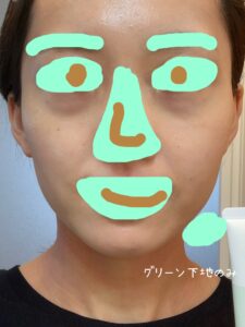 ↓下の写真はグリーン下地を全顔に塗布した肌です。